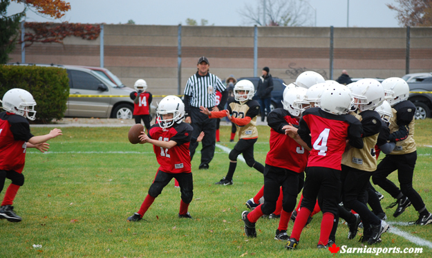 The day's finale had the Mammoet Crane Incorporated Mammoths playing the Sarnia Police Association Tiger Sharks. The Sharks scored all their points in the first half on a pair of touchdowns each by Austin Clement and Keyshaun Jordan. Nick Snow scored on a 1 yard quarterback sneak for the Mammoths after an inspiring 65 yard run by Patrick Miller. Miller himself counted the second Mammoth major on a 44 yard run. The Tiger Sharks won 28-12.