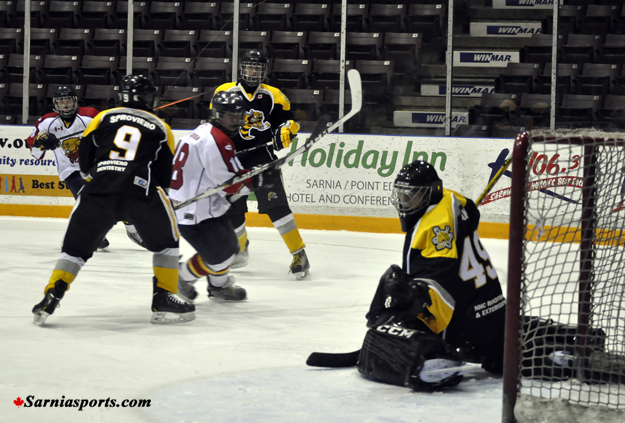 In the first period, Lambton gave away their first goal after giving up a 5 on 3 power play by Josh Pope-Ferguson of Sun County broke away and went in and scored a shorthanded goal. Lambton came back and tied the game while on a power play. Franco Sproviero shot from just inside the blue line to even the score. Eric Marsh and Brock Perry earned the assist on Sproviero's goal. Sun County regained the lead at 6:34 on a power play and held on for the win.