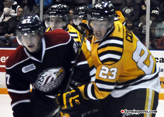 Justin Fazio (who has spent the bulk of the year tending goal for the Jr. B Lambton Shores Predators) made the first start of his OHL career (he had previously played one period of hockey for the Sting, earlier this season). Fazio looked very good, in stopping 32 of 35 Saginaw shots.