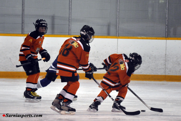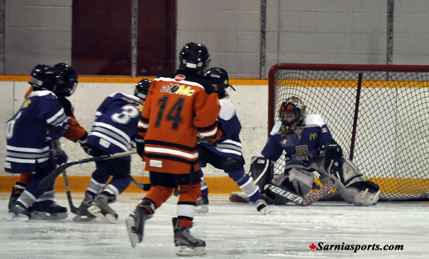 The first period only saw one goal and it came unassisted off the tape of Matthew Stojcevski. But in the second period The Marlins came alive. Owen Dufor and Chris Latosinski teamed up to tie the game and take the lead with a goal going to each player. Just before the end of the period Stojcevski netted his second and it was all square heading into the final frame. In the final period the lead was tossed around like a bag of Oreos first going to the Marlins when Maitrey Amrutiya put one in the back of the net, but then going to the Tigers when Stojcevski scored his third of the game, followd by team mate Alex Weir giving the White Tigers the lead. With 3 minutes left on the ice, over the boards came Zach Woods though, who tied the game in the nick of time. The score in this one ended up 4-4 after a spirited bout.