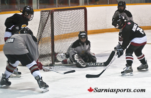 In the third period with the Storm up by two, Lakeshore would press for a goal, but with the puck in their own end, their defence came up big with blocked shots. But the pressure would finally collapse the defence, as a shot of the board goes to Tyson Passingham who finds Travis Nicholson alone in front who beats Hendrie five hole to put the Storm up 3-0.