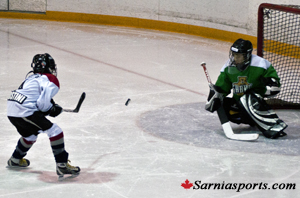 They would continue to attack as Ryan Prouix had a chance alone in front, but Axani got enough of the puck to send it wide of the net. Axani would be challenged again by Dafoe looking for his second goal. On much the same move he did before, cutting hard at the top of the crease, but Axani was there, coming out to challenging and causing the shot to go wide of the net, keeping the White Sabers still in the game down by two after the second.