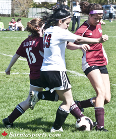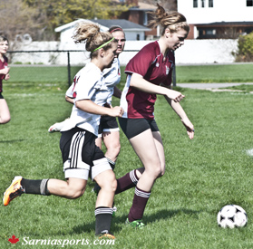 The first place Vikings showed their offensive power against the Eagles, keeping the ball constantly in the Eagles half, and quickly pouncing on it when it crossed the centre. Viking goalie Deanna Ritchie went most of the contest untested while the Vikings were relentless with their attack on North Lambton keeper Kerrie Dirven.
