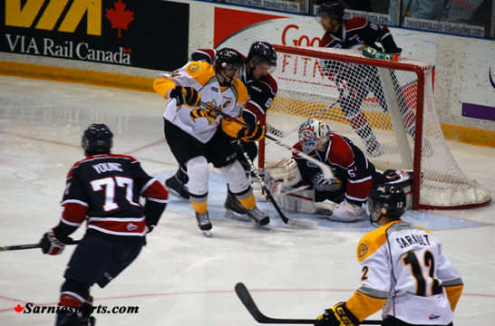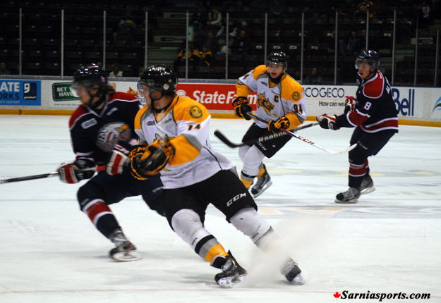 In the second Boucher tied the game scoring his third of the night and 19th of the season with Sarault and Galchenyuk assisting at 11:04. Sarnia took the lead for the first time at 16:42. Charlie Sarault scored assisted by Davis Brown and Alex Basso. With just :11 seconds remaining in the second period Brett Hargrave scored what turned out to be the game winner with Alex Carnevale and Davis Brown assisting.