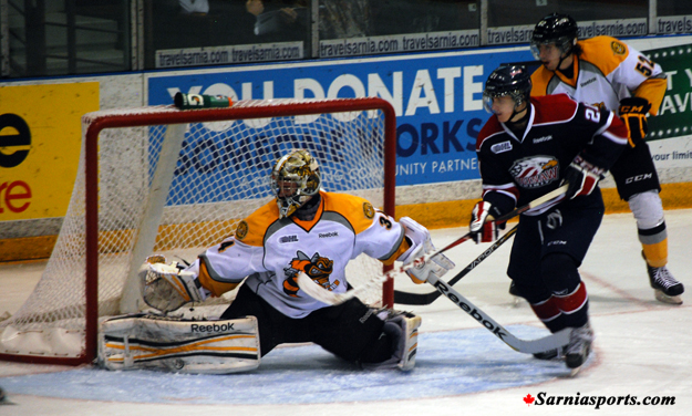 Sarnia outshot Saginaw 37 - 33 and after a shaky start in the first period J.P. Anderson bounced back and earned the win. Jake Paterson took the loss.