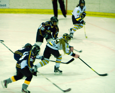 The third period would offer the Lady Sting many power play chances, as the Ravens were paraded to the penalty box. The Waterloo staff and supporters would become very excited. Sarnia would buzz the Waterloo net, but could not convert on any of the power play chances. Regulation time would expire, and an extra five minute sudden victory overtime period would be needed.