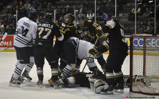In the standings race Owen Sound just slid into 4th place in the Western Conference. Both teams are tied with 69 points after 62 gamess. Owen Sound is 31-24-3-4, Sarnia is 31-24-2-5