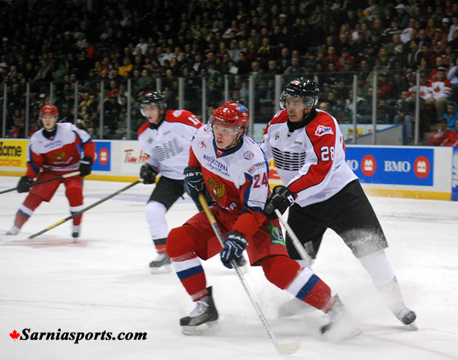 As time was winding down Team Russia pulled their goalie for the extra man attacker and it was fan favourite former Sarnia Sting Nail Yakopov who was left in the open in front of the net and didn't disappoint and fired it in for the lone goal for Team Russia. Even though it was Team Russia scoring the fans erupted and cheered after Yakopov scored what will probably be his last goal in Sarnia. Team Russia continue to press but was denied scoring another goal.