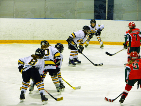 Another away game in Woodstock, on Saturday afternoon, the Lady Sting met one of their toughest opponents yet. The Woodstock Wildcats, operate with a short bench and an exceptional goaltender. It was still not enough, as the Lady Sting scored mid-way through the third period to take the lead. Abbie Clouse was called upon, with only two seconds remaining, to make a game winning save. Scoring was Brooke "Gus" Lauwers.