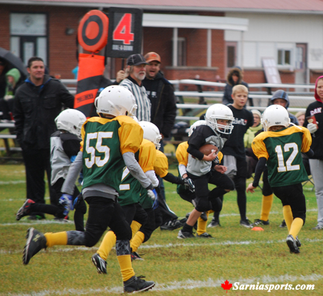 The day's finale had the Mammoet Crane Incorporated Mammoths playing the Sarnia Police Association Tiger Sharks. The Sharks scored all their points in the first half on a pair of touchdowns each by Austin Clement and Keyshaun Jordan. Nick Snow scored on a 1 yard quarterback sneak for the Mammoths after an inspiring 65 yard run by Patrick Miller. Miller himself counted the second Mammoth major on a 44 yard run. The Tiger Sharks won 28-12.