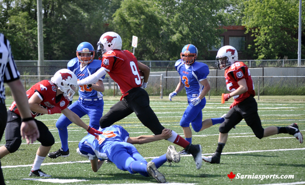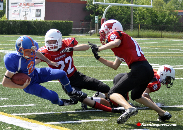 The Burlington Stampeders stomped the Sarnia Sturgeon Jr Varsity with a final score of 59 - 0 at their home opener at Norm Perry Park on Sunday. The Stampeders are 5 - 0 for the season, Sarnia is now 2 - 2. The Sturgeon are back in action on Sunday June 30 at 5:00 pm when the host Brantford at Norm Perry Park.