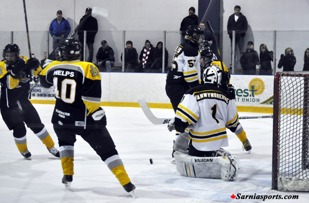 In game seven Waterloo took the lead midway into the first period when Brendan Schneider scored a power play goal for the Wolves. Less than a minute later Franco Sproviero slapped one in to even the scored. Alec Dekoning and Brock Perry assisted on the goal. With 1:27 left in the period Dekoning gave the Jr Sting the lead scoring a power play goal to give Lambton the 2 - 1 lead heading into the second period.