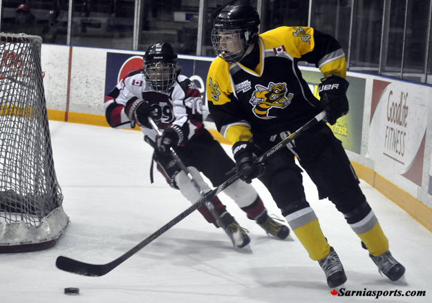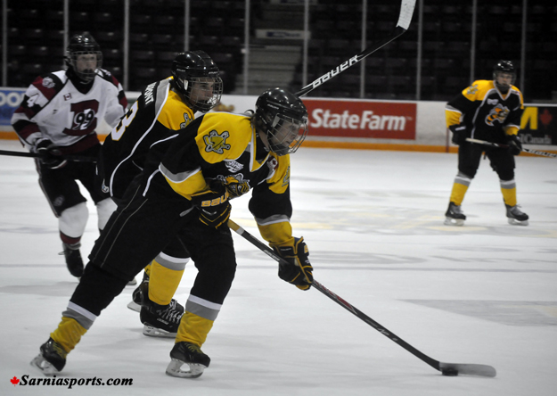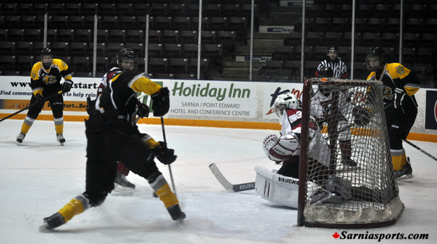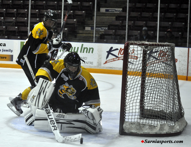 In the first period Alec Dekoning scored the first goal shorthanded after shooting the puck out of the corner that bounced off a Brantford player into the net. Brantford tied things up in the second with Dustin Barr scoring. Lambton regained the lead on power play that was set up on a perfect play by Dekoning who passed it out front from behind the net to Marco Mini who slapped it into the glove side opening for the goal. Brock Perry earned an assist on the play. After two periods of play the Jr. Sting had a 2 - 1 lead.