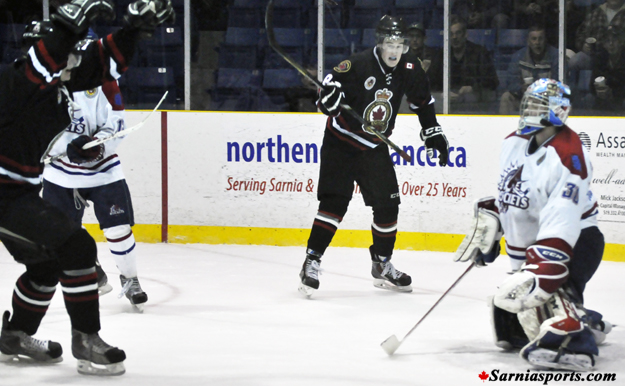It actually took over seven-and-a-half minutes of play for the first goal to be scored -- but the floodgates opened up quickly after that. The Legionnaires were pressing from the start of the period and were finally rewarded when Josh Kestner jammed the puck home at 7:32. A couple of minutes later Cody Trowell deflected one past Strathroy goalie Jack Moylan to make it 2-1. With all the momentum in their favour, it looked like Sarnia might ride out a 2-1 win. But Strathroy stunned the home crowd with a pair of late goals -- the last one, with exactly one minute left in the third period -- to take a 3-2 lead. However, there was more drama to come.
