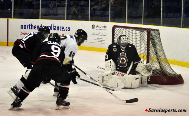 Sarnia goalie Hunter Johnson made 29 saves to pick up the win. Sarnia outshot LaSalle 35-34.