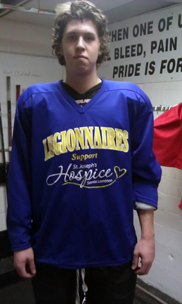 Pictured is Thomas Moxley wearing one of the practice jerseys that will be auctioned off at the end of January. Biding sheets will be available during all home games in January.